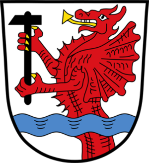 In Silber ein wachsender roter Drache mit einem schwarzen Hammer in den Klauen, überdeckt mit einem gesenkten blauen Wellenbalken.